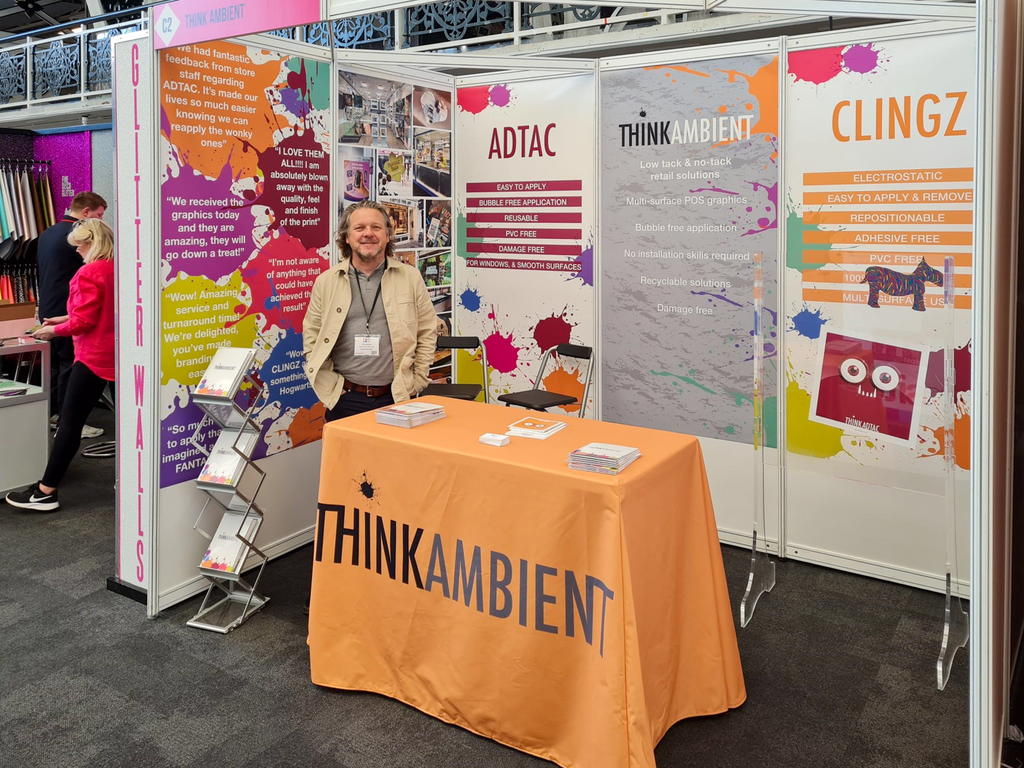 Stretch-Stoffe mit Gummikanten können in Rahmen gesteckt werden, um ein perfektes Display zu schaffen, wie das, vor dem Phil stolz steht. Diese Rahmen können dauerhaft sein, mit austauschbaren Grafiken, oder selbst gebaut und frei stehend. Ein großer Vorteil dieser Art von Rahmen ist, dass sie von hinten beleuchtet werden können, d.h. lebendige, leuchtende Displays und sogar doppelseitige Totems. Diese sind schwieriger zu installieren und benötigen eine Stromquelle, aber nehmen Sie einfach Kontakt mit uns auf und wir können Ihnen erklären, wie sie funktionieren.